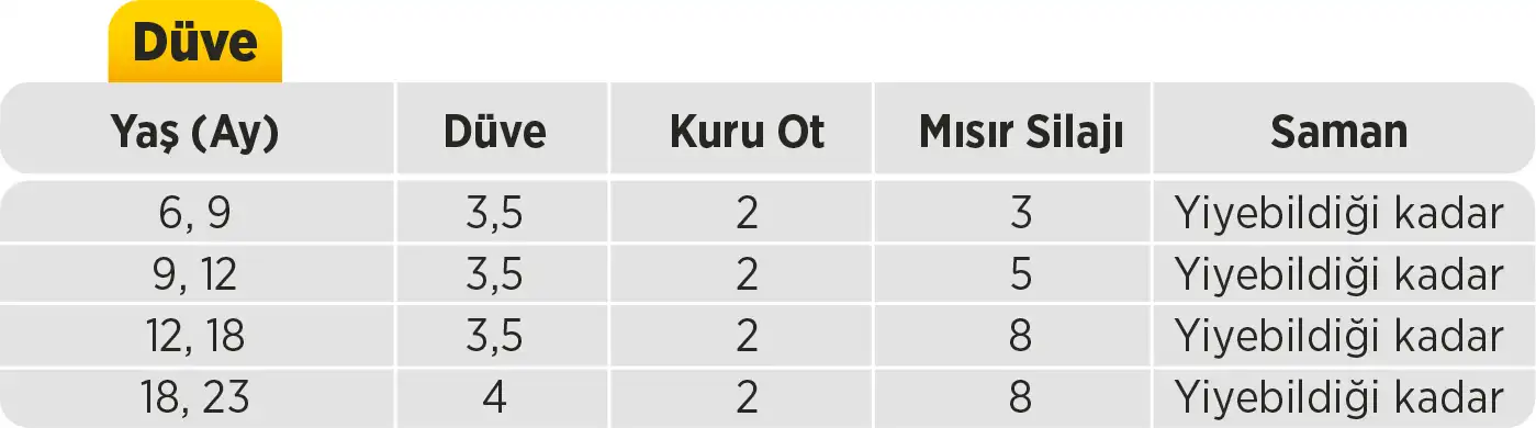 Damızlık düveler 6 aylık yaştan tohumlanana kadar günde 850-900 gr., tohumlandıktan doğuma 1 ay kalan kadarli dönemde günde 800-850 gr. Kilo alacak şekilde beslenmelidir.